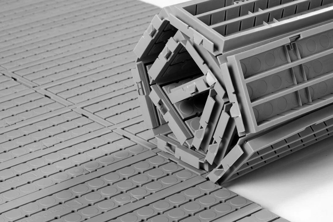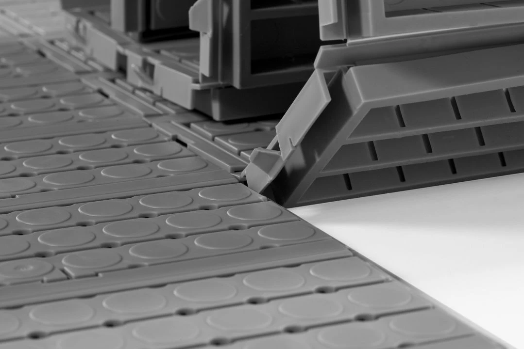 EXPO-roll besteht aus robustem Polypropylen (PP), einem langlebigen Kunststoff. Die einzelnen Elemente sind stoßfest und rutschhemmend konstruiert.