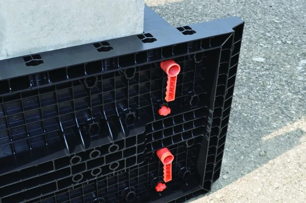 Sie verbinden die Paneele mit den typischen Geoplast Red Locking Pins. Diese roten Verriegelungsgriffe greifen in die vorgesehenen