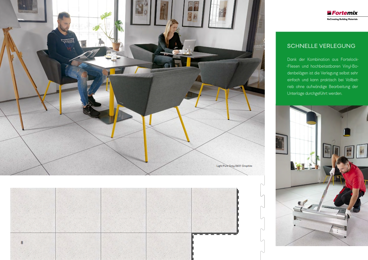 Diese Fliesen vereinen die einzigartigen Eigenschaften von Fortelock-Fliesen und Top-Produkten der weltweit führenden Hersteller von hochbelastbaren Vinyl-Bodenbelägen.